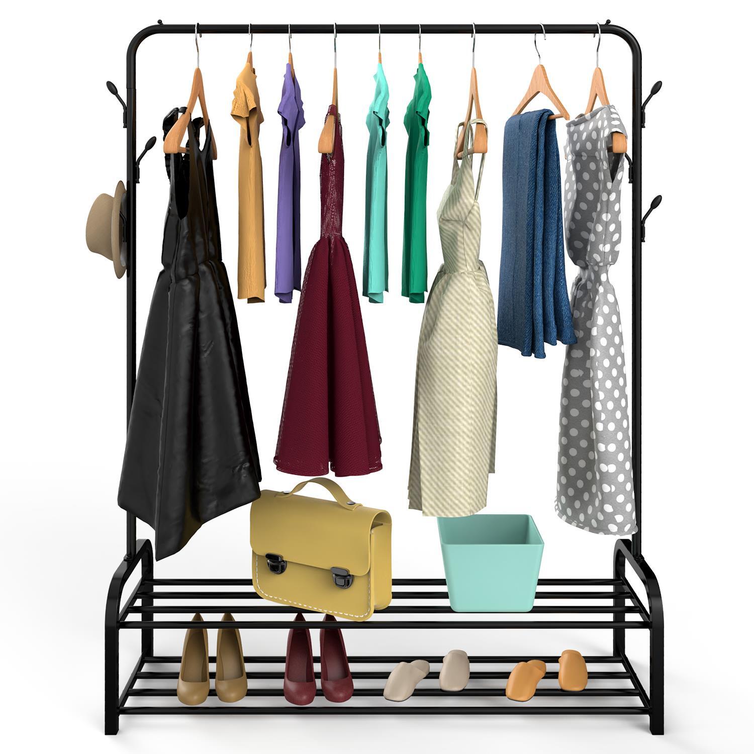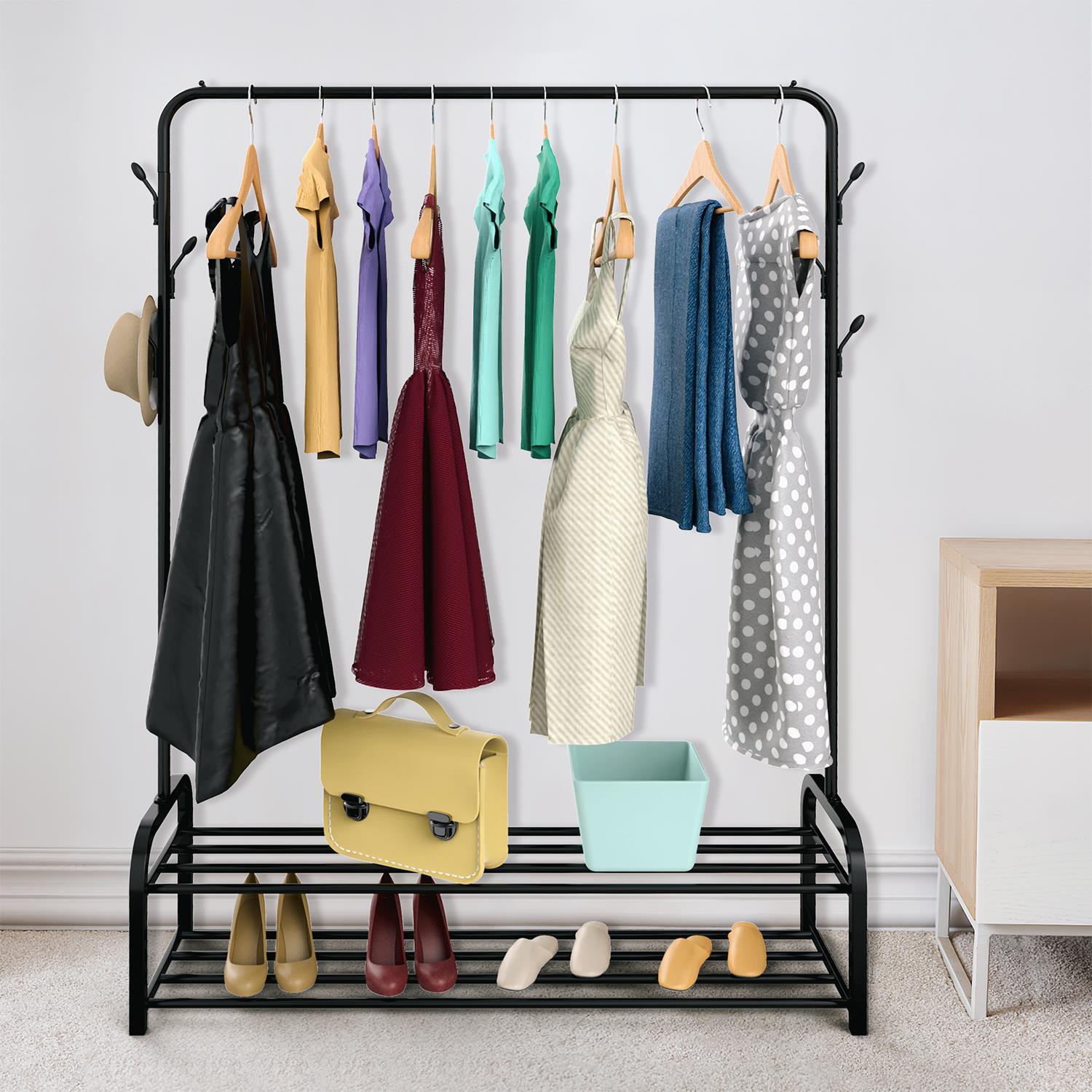 MULTIFUNCTIONAL ENTRYWAY ORGANISER: Uncomplicated combo of clothes rail and shoe rack, excellent for displaying your seasonal favourites or organizing your everyday attire. This clothes rail comes with detachable hook for your coats or bags and anti-slip stoppers to prevent the clothes from falling, and double shoe rack where shoes, boots or other accessories can be kept.DURABLE AND STURDY: Made from premium quality varnish metal giving maximum strength and durability, ensuring maximum usage. This free-standing garment rail is solid and can easily to hold up to 60kg of evenly distributed weight (40kg on the hanging rail and 20 kg on the lower shelves).MODERN SLEEK DESIGN: The sleek design of the minimalist clean look is attractive to the sight. Perfect size to fit in your bedroom, hallway, bathroom, and entry hall. This can also be used for many ways to display the clothes, retail shop displays, market stall displays, fashion houses, car boot sale displays, exhibitions, cloakrooms, and domestic use.EASY ASSEMBLY: Comes with easy-to-follow instructions and uncomplicated parts which can be assembled in minutes. Product assembled approx. size 155 x 38.5 x 120 cmCLUTTER-FREE HOME: Graceful and simple design, this elegant multifunctional organiser will let your hallway, entryway, or balcony more organized. It's an essential product for a clutter free home and a comfortable life.