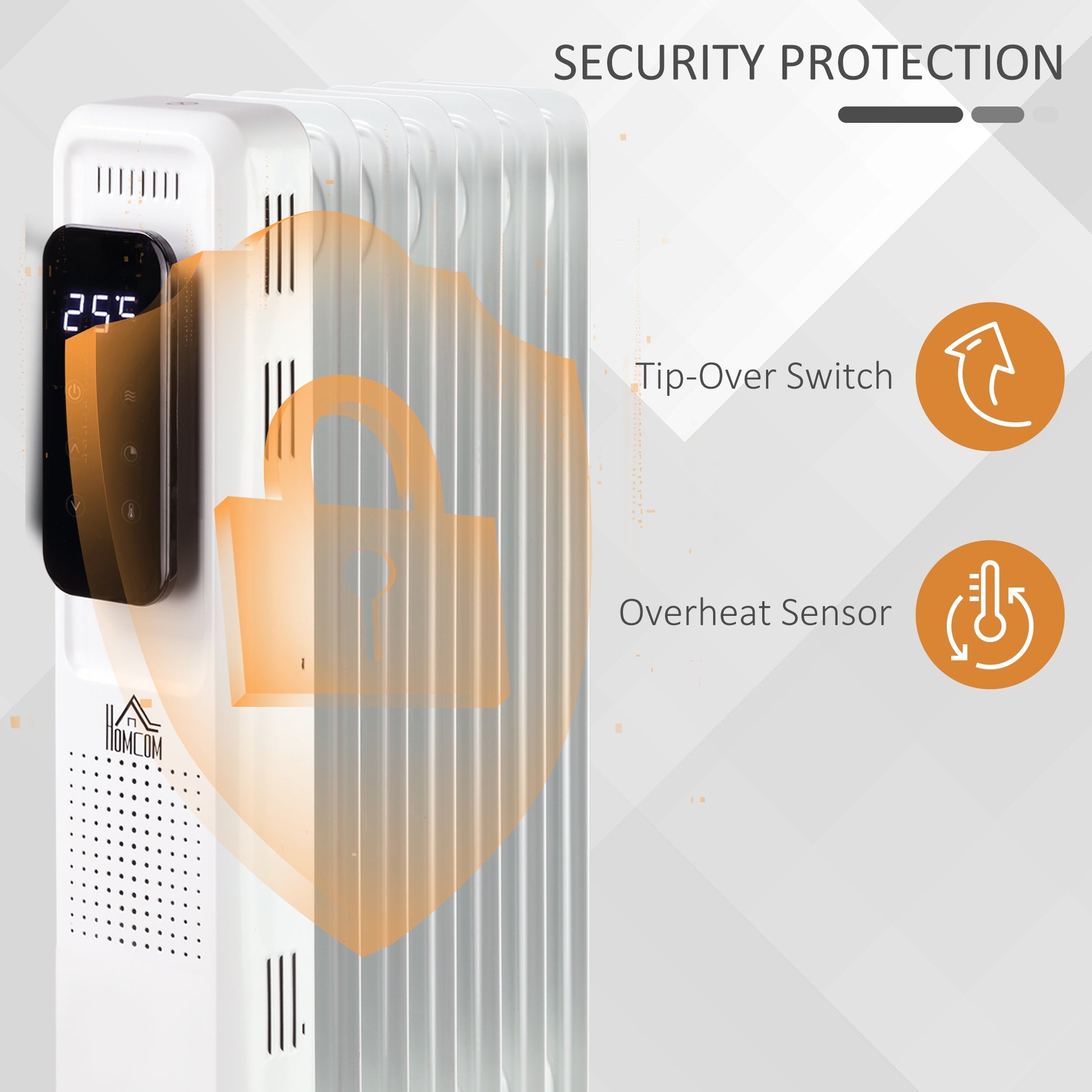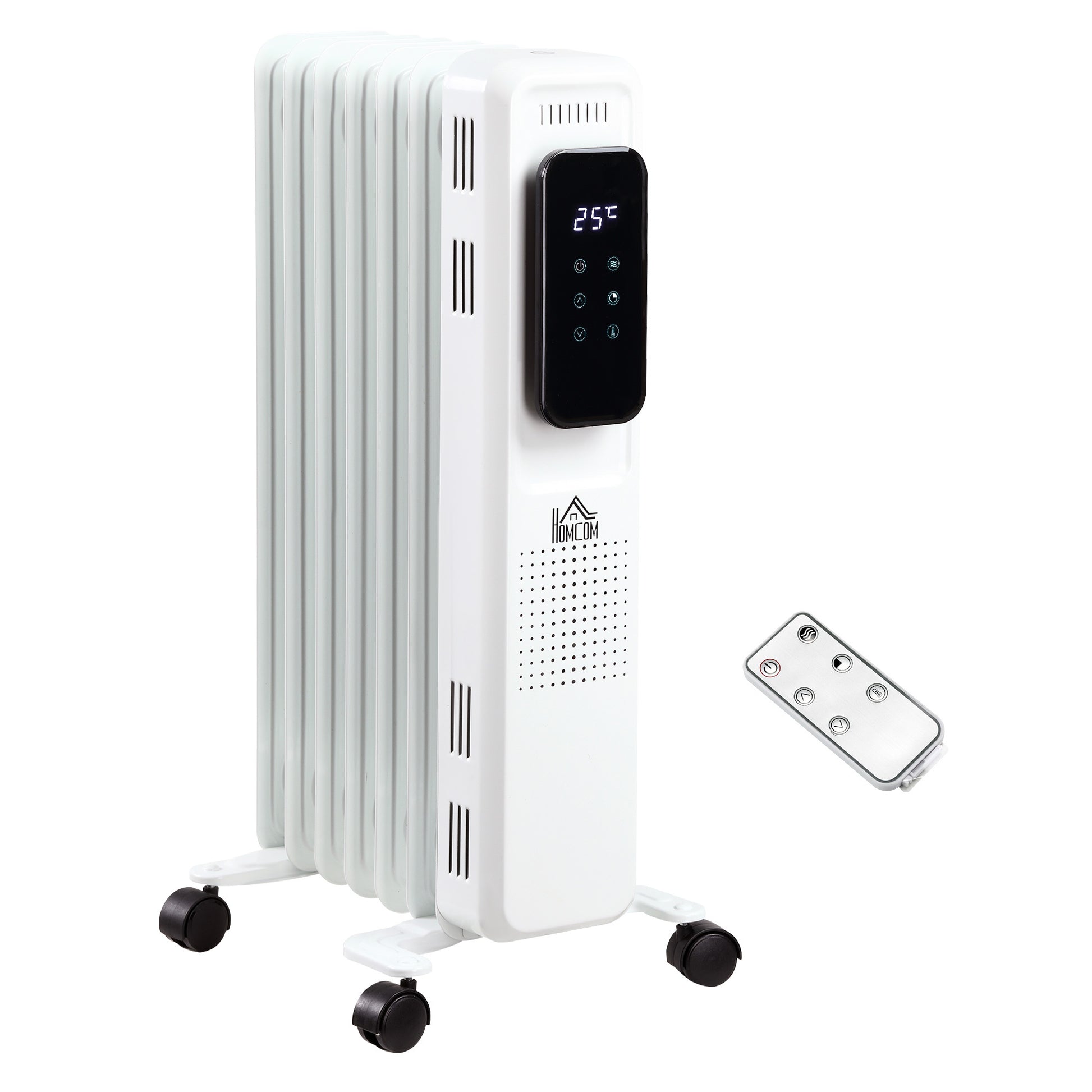 When the weather starts to turn icy, you will need this oil-filled radiator heater. Our HOMCOM oil-filled radiator with 7 heating pipes is perfect for keeping your bedroom, living room, home or office warm. Plus with three power settings, low, medium and high, you can find your preference temperature with total ease. The 360 degree wheels at bottom for easy movement. Don't let your fingers and toes freeze and trust in our oil heater to deliver warm heat from any room in the house.Features: - 3 heat settings and ECO mode for flexible heating efficiency;- With 7 heating fins and 3 heat output settings to effectively heat rooms;- A 24-hour timer also allows you to switch the radiator on or off when you desire;- The temperature can be adjusted between 15-35? to make body feel comfortable;- The easy-to-use digital display and remote control allow you to set any functions;- 4 castors plus a handle for easy moving,- Built-in overheat protection and tip-over switch ensure the radiator instantly switches off; - Cable organizer for tidiness without worries of wire entanglement;Specifications: - Colour: White;- Material: Steel, PA;- Overall Dimension: 34.5L x 24W x 63Hcm;- Power: 1370W-1630W;- Temperature Range: 15-35?;- Timer: 24H;- Suitable Acreage: 9-15?;- Working Noise: 0dB;- Power Cable Length: 1.5m;- Rated Voltage: 220-240V, 50/60Hz;- Rated Current: 6.22-6.79A;- Certification: UKCA+CE(LVD, ROHS, ERP, EMC);- Item Label: 820-260V70