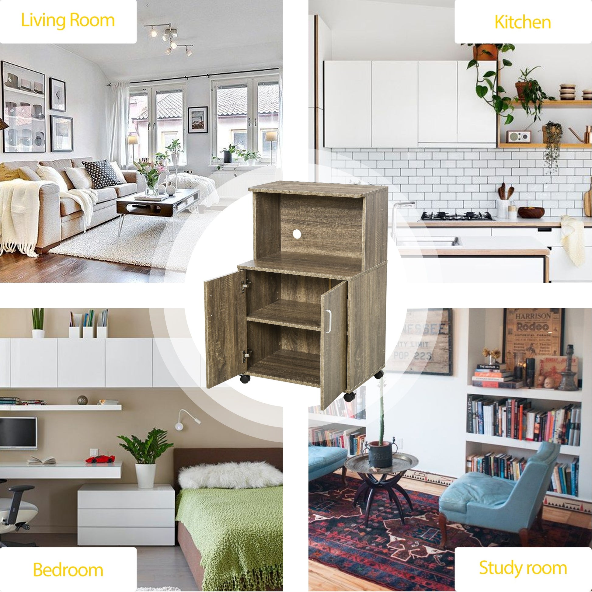 Give your microwave its own pride of place and help increase your kitchen space, thanks to this storage cabinet from HOMCOM. Made from particle board in a thick formation for long term use, it�s crafted into a space-conscious design with the bottom cupboard and top open compartment. The inner adjustable shelf brings organisation for plates, packages and more, with the two handles meaning you can open it easily. Four castor wheels mean you can move it easily � even when full � with brakes on the two wheels so it keeps stationary. It�s finished with a cable hole on the back for extra organisation. You�ll never be left short on space again thanks to this stylish piece.
