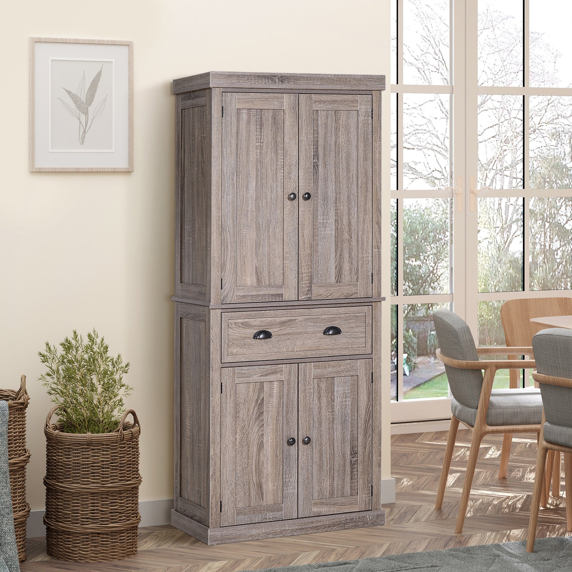 - "Freestanding Pantry Cupboard Storage Cabinet Home Organizer Furniture"- Description: - Spacious Space: Features a top and bottom cabinet and a middle slide-out drawer for ample storage and organization of kitchen and homeware. - Movable Shelves: 3 adjustable shelves provide flexibility in storing items of different heights and sizes in your kitchen larder cupboard. - Study Built: Reinforced strength ensures durability for prolonged use in your home. - Anti-tipping design: Wall attachments on the backboard ensure stability and prevent accidents, making it ideal for homes with children and pets. - Beautiful Form Factor: Kitchen larder cupboard with recessed door panels and antique brushed nickel hardware, enhancing the look of your home and fitting with most decor. - Dimensions: 184H x 76W x 40.5Dcm. Top cabinet: 82.5H x 32.5Wcm. Bottom cabinet: 61H x 32.5Wcm. Inner drawer: 10H x 61.5W x 33.5Dcm. - Maximum Load Weight: Whole: 100kg. Shelf: 10kg. Drawer: 8kg. - ASSEMBLY REQUIRED.