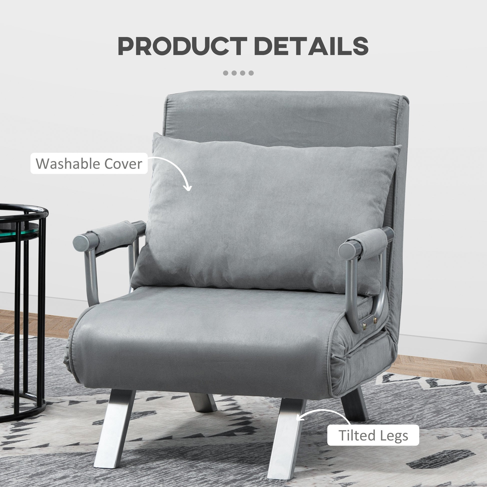 TWO-IN-ONE DESIGN: Transforms from a single chair to a sofa bed - an excellent space saver for smaller spaces. Ideal for when visitors stay overnight, giving them somewhere proper to rest.ADJUSTABLE BACK: Can be set to five different positions, allowing you to find the perfect shape which supports you as you rest and sleep.STEEL FRAME: A solid structure which supports your body when in use. Four angled legs to keep the balance. SPONGE PADDING: Thickly filled, ensures you'll be sitting comfortably. Also comes with cushion for extra comfort and support.SUEDETTE UPHOLSTERY: Making the foldable bed soft to the touch and create a stylish look.FOLDING CHAIR BED DIMENSIONS: Chair: 80H x 65W x 69Dcm. Bed: 25H x 185.5L x 60Wcm. MAXIMUM LOAD 100KG. ASSEMBLY REQUIRED.