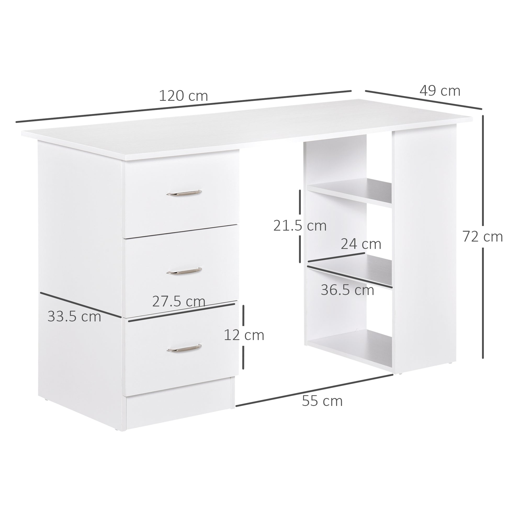 Classic Design: Simple boxy shape in a neutral shade - the computer table looks simple and works itself effortlessly into lots of home, office and bedroom spaces.3-Tier Shelves & 3 Drawers: This home office desk features 3 drawers for storing your office essentials. 3 open shelves provide extra space for displaying your favourite items. The drawer can be installed back or forth according to your needs, which makes the open shelf can be on the left or the right sideLarge Tabletop: This study desk with shelves has a large 120cm table top that provides you with an ample working area and a place for your laptop and other accessories.Sturdy: Made from particle board, the structure of PC desk is considerably tough and supports you as you work. Large legs to keep table balanced and steady.Dimensions: 72H x 120W x 49Dcm. Drawer: 10H x 28W x 33Dcm. Shelf: 21.5H x 33W x 24Dcm. Weight Capacity: 20kg, Assembly Required.