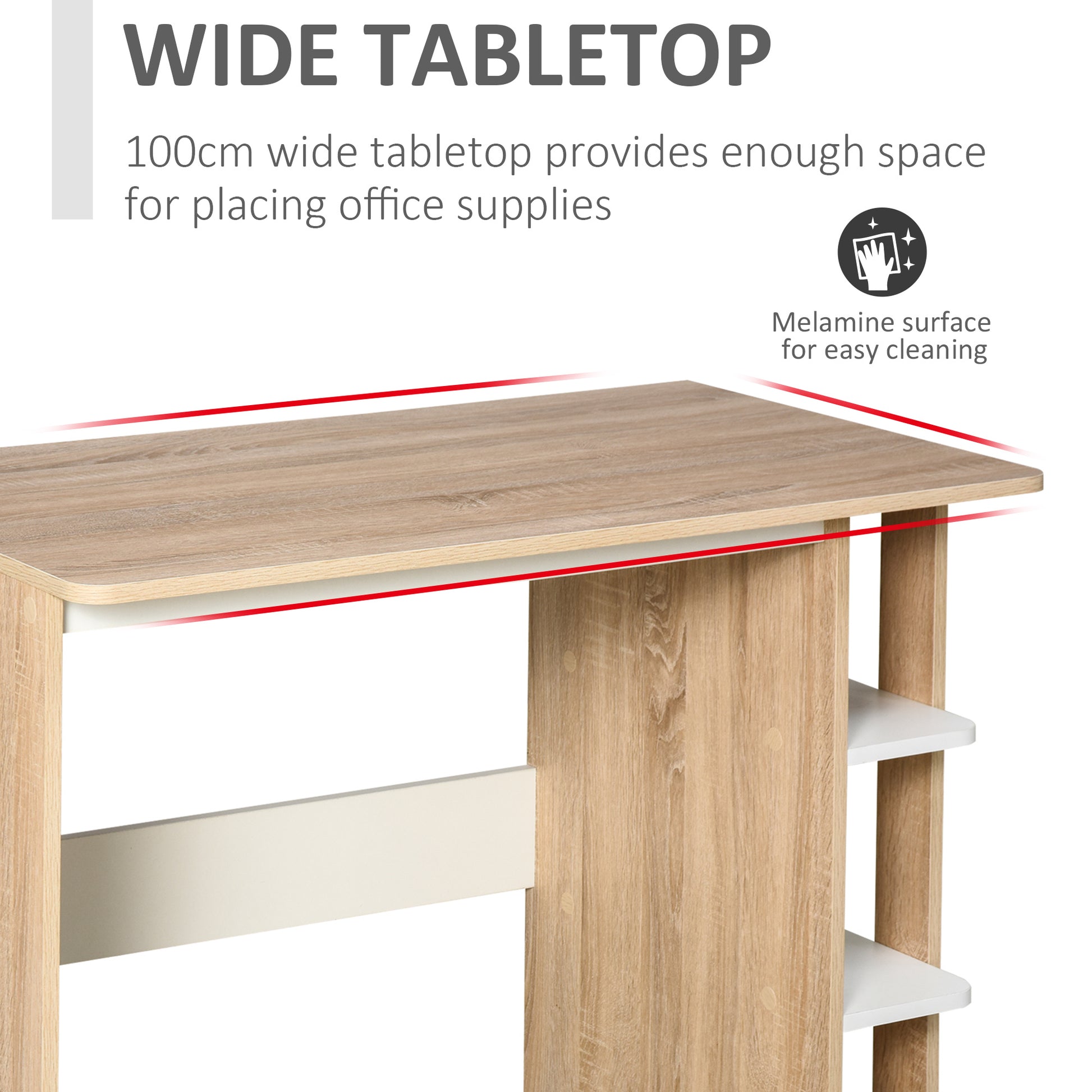 Versatile: Suitable for every room, the white and oak wood-effect designed home office desk is fresh and beautiful. Great for the home, office and beyond.Wide table top: This study desk provides large space for you to work with plenty of space. Gives room for your laptop, and other work essentials.3-tier shelf: Placed on the side of the PC desk, for discreet and easy-to-reach storage and organisation.Solid structure: Made from particle board, the computer table is sturdy and durable. Dimensions: 74H x 100W x 55Dcm.Maximum load 30 kg. Assembly required.