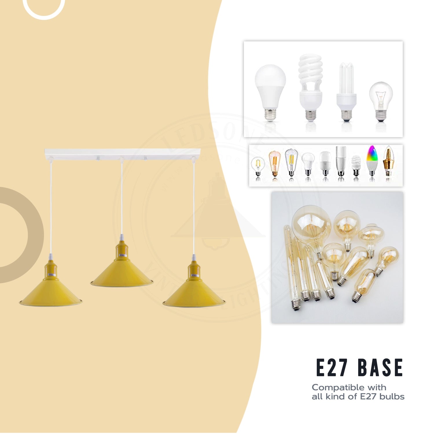 Features:The 3 way pendant light kit is designed with contemporary style.A wonderful choice for achieving your desired fashion and functional needs of your home.Designed with E27 lamp base, filament retro bulbs will be a good choice to bring out the character of this fitting.All the wire and hanging cord are comply with British standard.It can be dimmable when, used with a matching dimmer switch and dimmable bulb.Item Specifications / Technical Details:Item Type: Pendant lightStyle: Vintage/RetroVoltage: AC110V-240VLamp holder quantity: 3Material: Metal and PVCBulb Requirements: Requires E27 max 60WBulb Type: Compatible with all kinds of E27 BulbsInstallation Area: IndoorPower Source: HardwiredDimmable: Yes (required a dimmable bulb and dimmer switch)Wire length: 95cm Adjustable cableEnergy consumption: A+ with LED bulbSloped ceiling adaptable.Package included:1 x Ceiling rose and all the necessary fittings3 x 95cm Adjustable Pendant holder with cable3 x LampshadeNote:Due to the light and screen difference, the colour of the item may be slightly different from the pictures.Please allow 1-2cm differences due to manual measurement.Delivery times can vary depending on the destination location. We would advise against booking an Electrician or fitter until you have received all items in satisfactory condition.Please kindly confirm the colour of the lamp before you buy it.