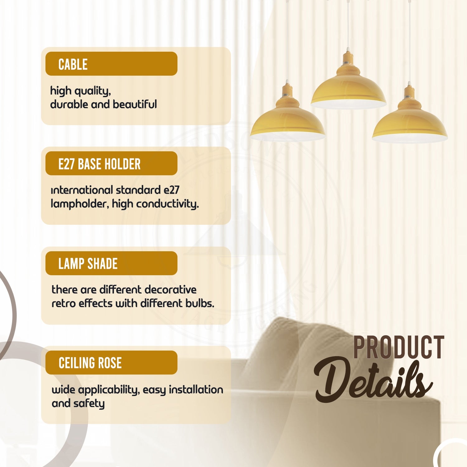 Features:The 3 way pendant light kit is designed with contemporary style.A wonderful choice for achieving your desired fashion and functional needs of your home.Designed with E27 lamp base, filament retro bulbs will be a good choice to bring out the character of this fitting.All the wire and hanging cord are comply with British standard.It can be dimmable when, used with a matching dimmer switch and dimmable bulb.Item Specifications / Technical Details:Item Type: Pendant lightStyle: Vintage/RetroVoltage: AC110V-240VLamp holder quantity: 3Material: Metal and PVCBulb Requirements: Requires E27 max 60WBulb Type: Compatible with all kinds of E27 BulbsInstallation Area: IndoorPower Source: HardwiredDimmable: Yes (required a dimmable bulb and dimmer switch)Wire length: 95cm Adjustable cableEnergy consumption: A+ with LED bulbSloped ceiling adaptable.Package included:1 x Ceiling rose and all the necessary fittings3 x 95cm Adjustable Pendant holder with cable3 x LampshadeNote:Due to the light and screen difference, the colour of the item may be slightly different from the pictures.Please allow 1-2cm differences due to manual measurement.Delivery times can vary depending on the destination location. We would advise against booking an Electrician or fitter until you have received all items in satisfactory condition.Please kindly confirm the colour of the lamp before you buy it.