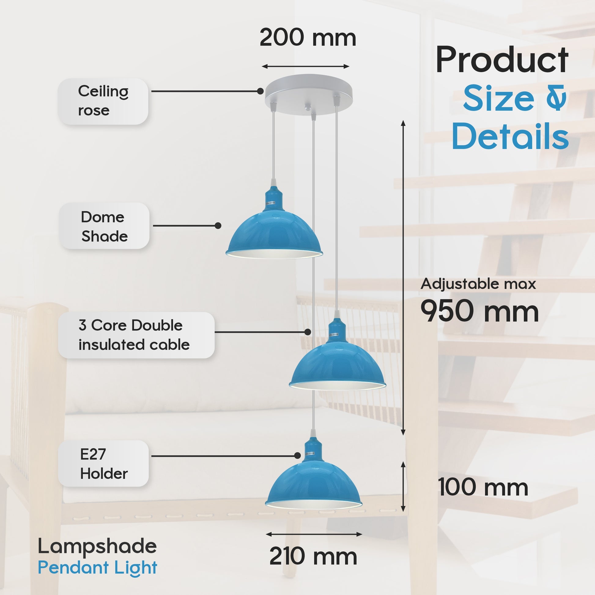 Features: •The pendant lamp is designed to a unique style which will bring an elegant-rich look to the space where ever you fix it.•Designed with E27 lamp base, E27 standard bulb, you can choose any bulbs with the E27 interface.•All the wire and hanging cord are comply with the British standard.•When used with a matching dimmer switch and dimmable bulb, it can be dimmable.•Safe and durable with CE approval and earth connection.Item Specifications / Technical Details•Item Type: Pendant Light•Style: Vintage/Retro•Voltage: AC110V-240V•Lamp holder quantity: 3•Material: Metal and PVC•Dimension of the shade: 21cm W X 10cm H•Ceiling base diameter: 20cm•Bulb Requirements: Requires E27 max 60W•Bulb Type: Compatible with all kinds of E27 Bulbs•Installation Area: Indoor•Power Source: Hardwired•Wire length: 95cm Adjustable cable•Sloped ceiling adaptable.Package included:•1 x Pendant Lamp Base with fitting accessories•3 x 95cm Adjustable cable with holder•3 x Lamp Shades