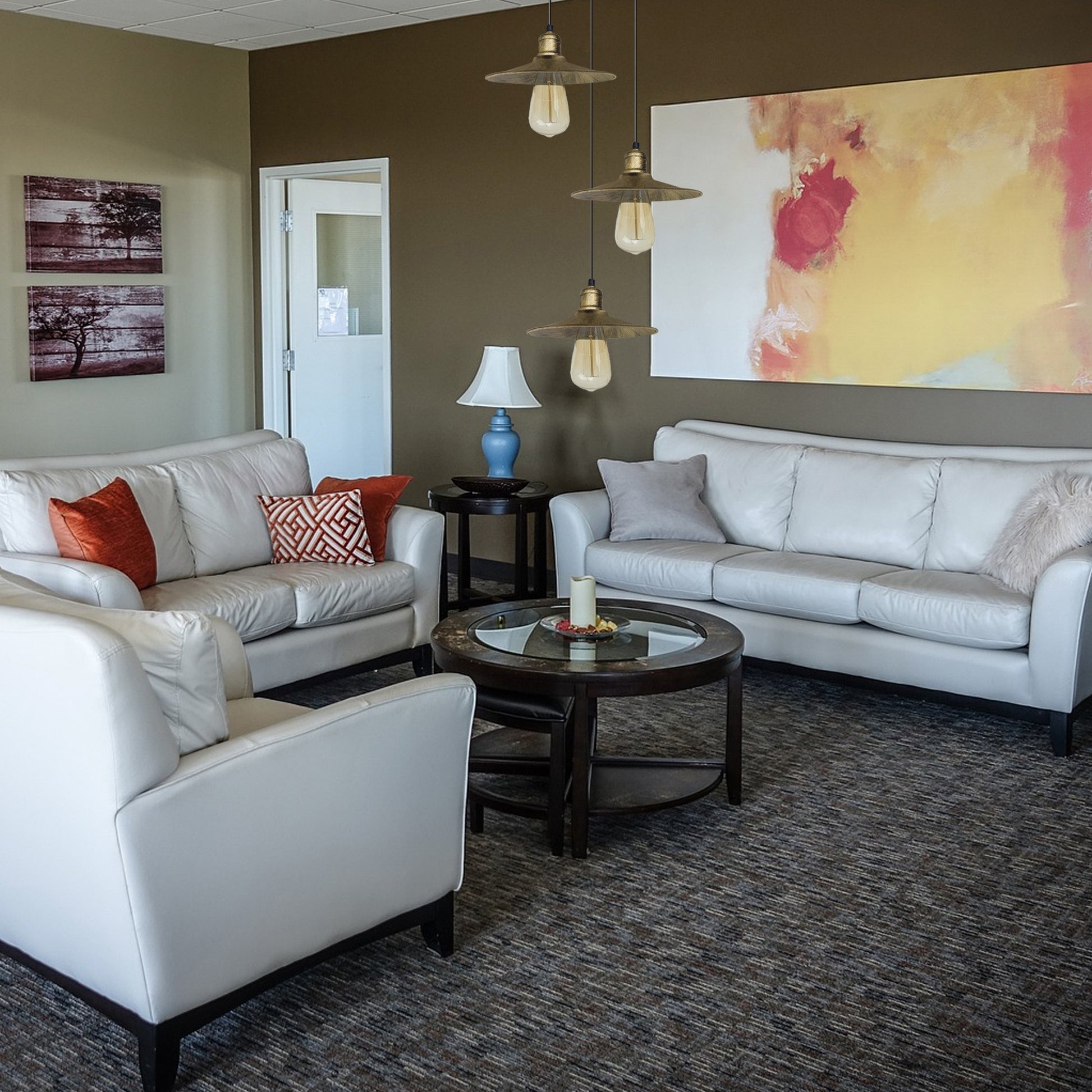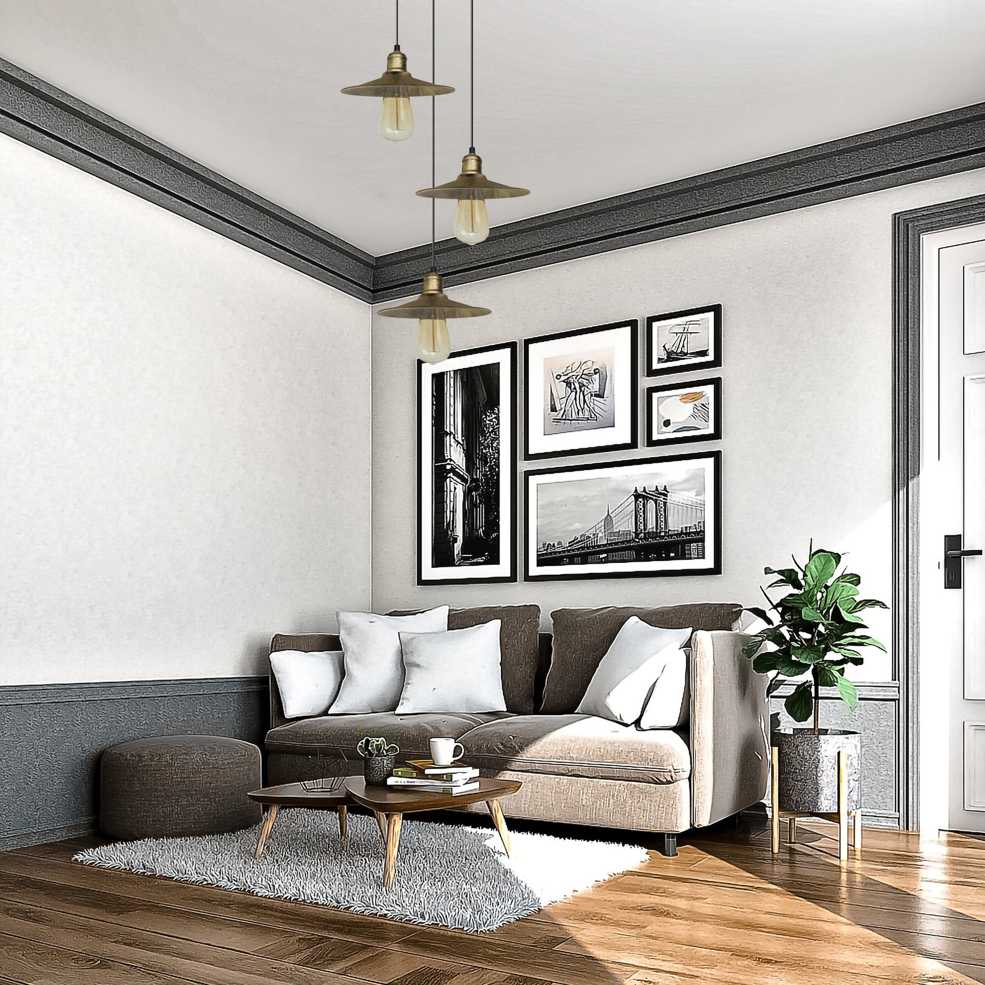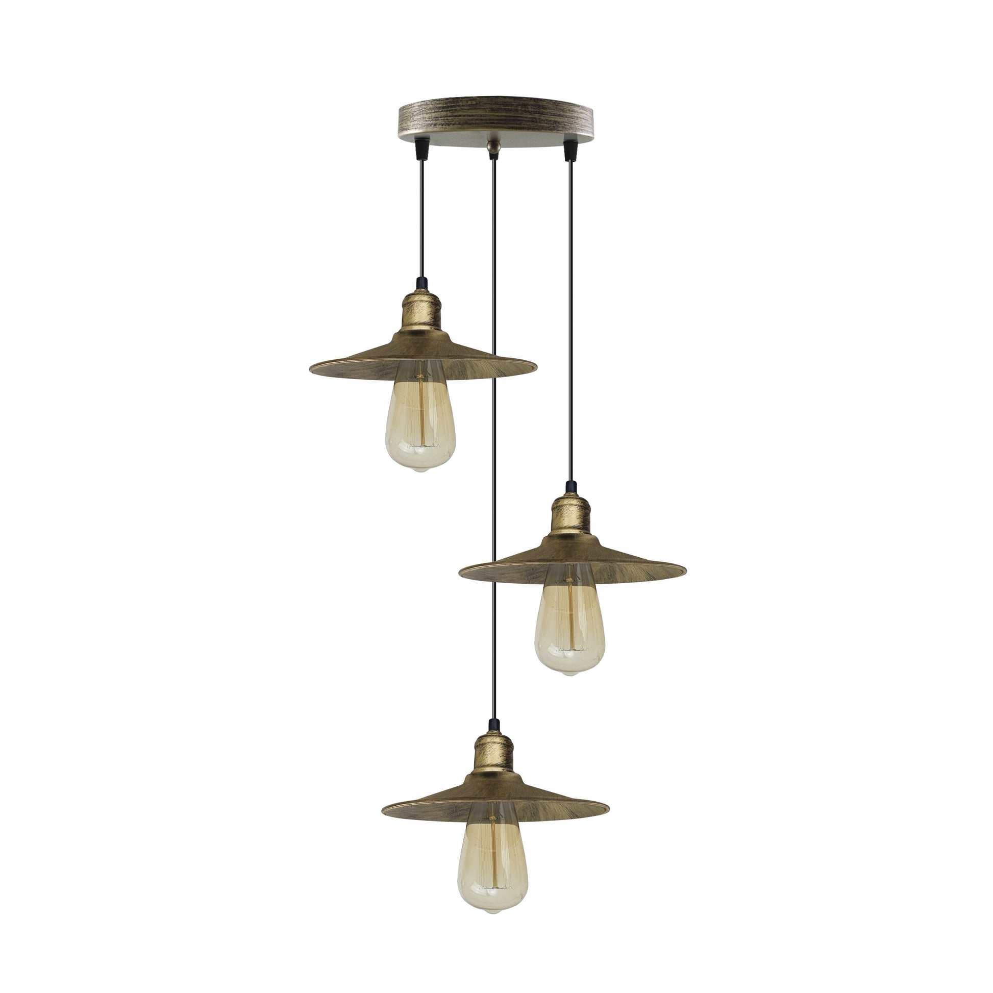 Features:Designed for adding a touch of rustic elegance to your home decor, this metal brushed brass ceiling pendant light will coordinate nicely with other items and augment the stylishness of your interior.Looks attractive and fashion in your existed lamp shade pendant light fitting kit.Perfect for your living room, dining room, cafe, bar, and more, these hanging ceiling light shades are a great way to add some vintage style to any room in your home.This ceiling fixture will work with compatible dimmer switches.The light fitting should be compatible with the E27 base, Which is a common and standard size for light bulbs, allowing users to easily find and replace bulbs.Specifications:Style: PendantStyle: Vintage/RetroShade shape: Flat shapeBulb requirements: Max 60WInstallation area: IndoorMaterial: MetalWire: 95cm Adjustable cableSocket Specs: E27Diameter of shade :22cmApplicable space: Living Rooms, Lounges, Bedrooms, Home Offices, Studies room, Studios, Apartments, Hotels, Restaurants, Cafes, and morePackage Includes:1 x Ceiling rose with fitting accessories.3 x Pendant holder with adjustable cable.3 x Lamp shade.Note:Due to the light and screen difference, The colour of the item may be slightly different from the pictures.Delivery times can vary depending on the destination location. We would advise against booking an Electrician or fitter until you have received all items in satisfactory condition.Please allow 0.2-0.5cm differences due to manual measurement.