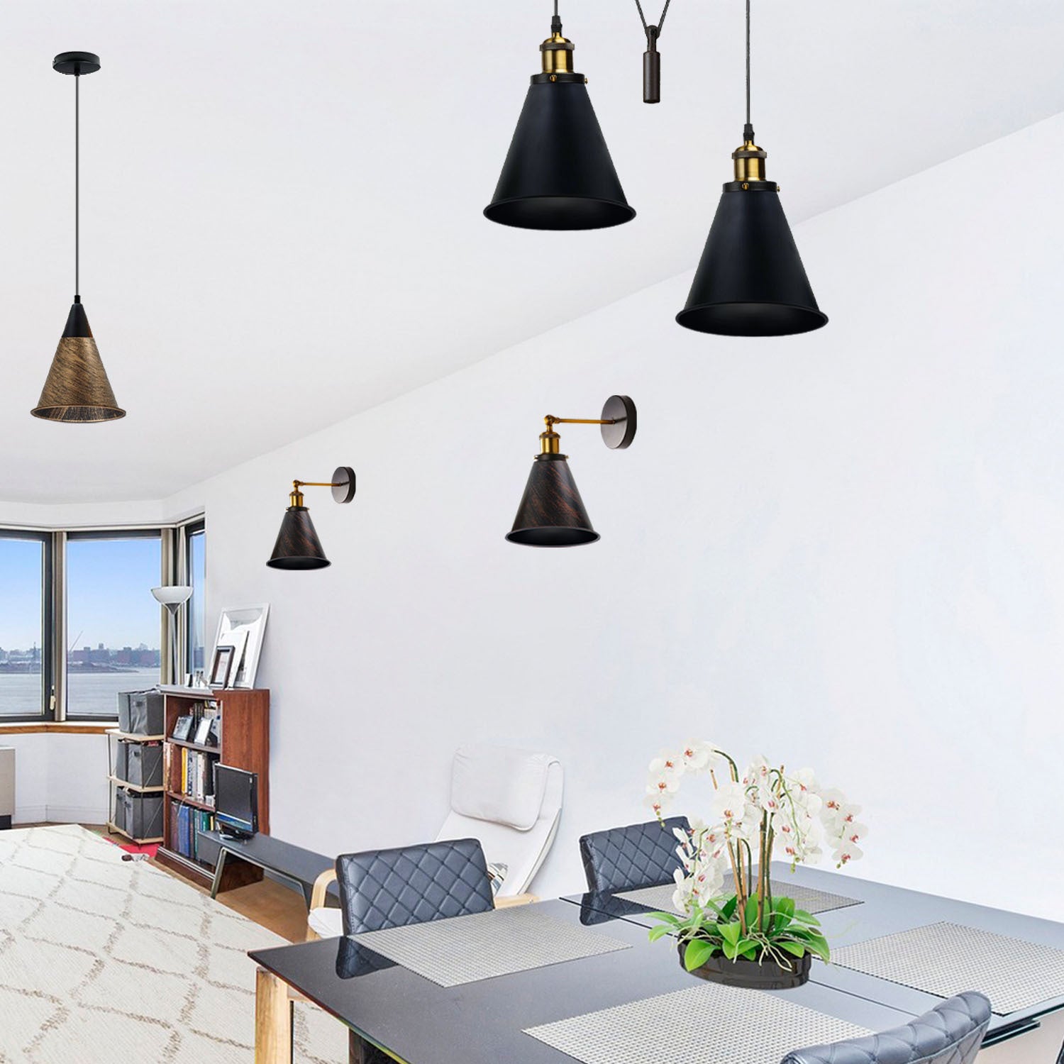 Features:This pendant lamp shade has a classic, Vintage-inspired style that works well with a variety of home decor themes.This simple, Sleek cone ceiling light shade for a vintage look.With a 18cm diameter, This pendant ceiling lampshade is large enough to provide ample lighting while also being compact enough to fit in most spaces.Perfect for your living room, Dining room, Cafe, Bar and more, These light shades are a great way to add some vintage style to any room in your home.The light fitting should be compatible with the E27/B22 base, which is a common and standard size for light bulbs, allowing users to easily find and replace bulbs.Item Specifications:Item Type: LampshadeStyle: Vintage/RetroMaterial: MetalDimension of the shade: 18cm W x 17cm HInstallation area: IndoorShade shape: ConeItem width: 18cmFeatures of the shade: No wiring required, Easy to fit, Simply attaches to your existing lights.Package Includes:3 x Light shades.3 x Reducer plates.Note:Due to the light and screen difference, The color of the item may be slightly different from the pictures.Made from high-quality materials like metal.Delivery times can vary depending on the destination location. We would advise against booking an electrician or fitter until you have received all items in satisfactory condition. Please allow 0.2-0.5cm differences due to manual measurement.
