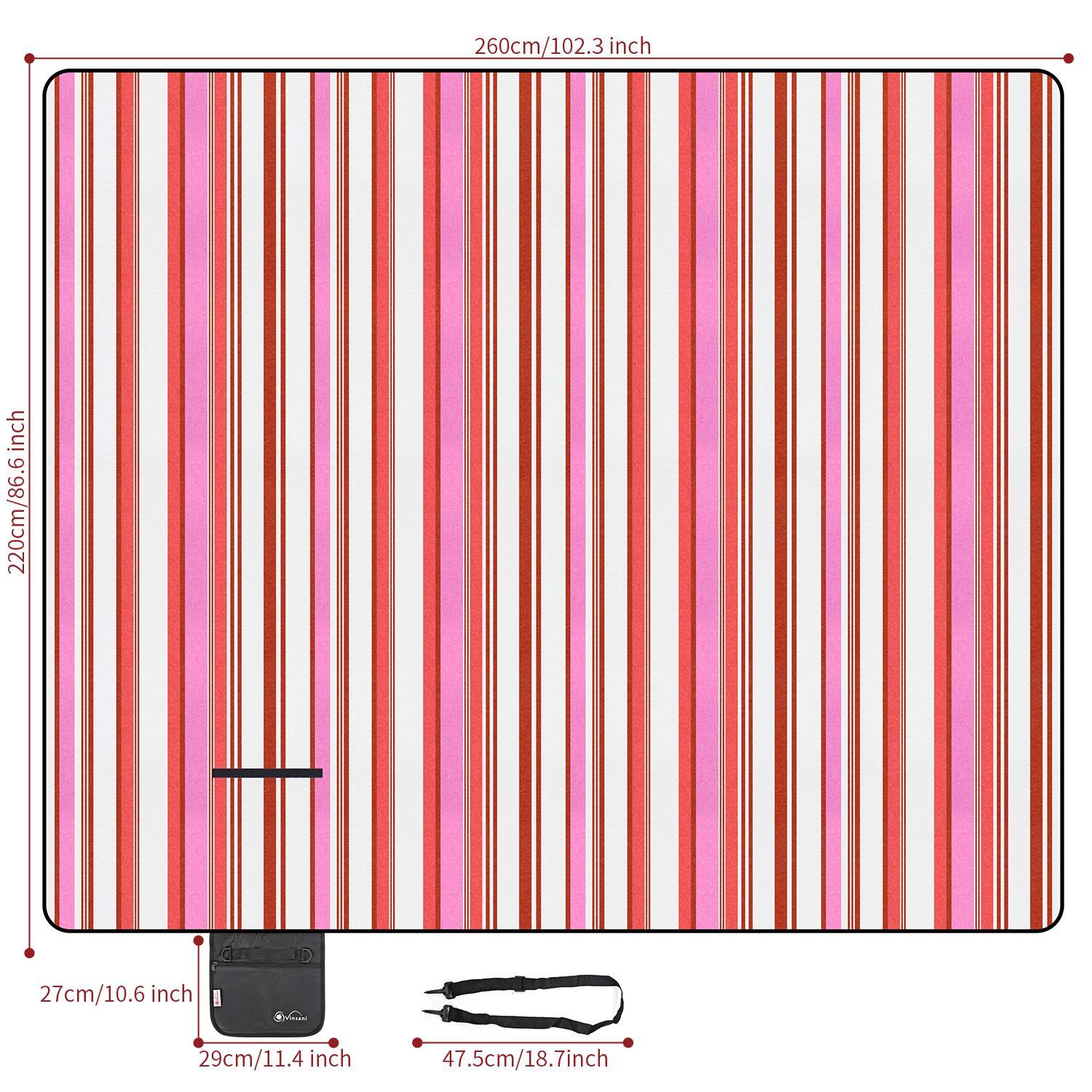 EASY CARRYING: This beach rug can be packed down to an impressive 43 x 29 x 13 cm; the attached flap and closure easily secure the blanket for easier portability; it is also light enough to stash in your bag.DURABLE MATERIAL: With the acrylic surface, ample sponge padding, this picnic blanket is tear-resistant and durable for extended outdoor use.EXTENSIVE USE: Suitable to be used indoors or outdoors, it is perfect for camping, picnics, days out to the beach or park, and summer festivals; it also can be used as a tent carpet or temporary bed.GOOD INSULATION: With the waterproof and sand proof backing that act as insulation, keeping the top surface comfortable and dry when used on damp grass or beach.DIMENSIONS: 260 x 220 cm; this super-sized sheet can comfortably fit 3-5 people; ideal for family picnics and days out. Please note images are for illustration purposes only and the colour patchwork on the item may vary.