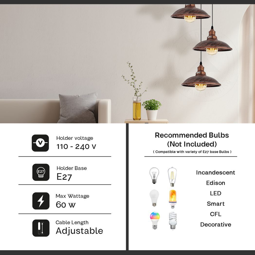 Feature:This simple, sleek pendant has unique finish for a vintage look. An electro plating on the holder of the hood enhances the illumination.It will be a perfect addition to your home decor and can be easily customized to your needs.E27 lamp base, you can choose any bulbs with the E27 interface as you want.Perfect to create a warm, romantic atmosphere for your home, restaurants, and cafes.CE certified, Also has 3 wires-live wire, neutral wire and earth wire, ensuring safety.Item Specifications / Technical Details:Item Type: Pendant lightStyle: Vintage/RetroVoltage: AC110V-240VMaterial: MetalBulb Requirements: Requires E27 max 60WBulb Type: Compatible with all kinds of E27 bulbsInstallation Area: IndoorDimmable: Yes (required a dimmable bulb and dimmer switch)Energy consumption: A+ with LED bulbs.Package included:1 x Ceiling rose with accessories.3 x Pendant holder with cable.3 x Lamp shade.Note:Due to the light and screen difference, the color of the item may be slightly different from the pictures.Please allow 0.2-0.5cm differences due to manual measurement.Delivery times can vary depending on the destination location. we would advise against booking an electrician or fitter until you have received all items in satisfactory condition.Please kindly confirm the color of the lamp before you buy it.