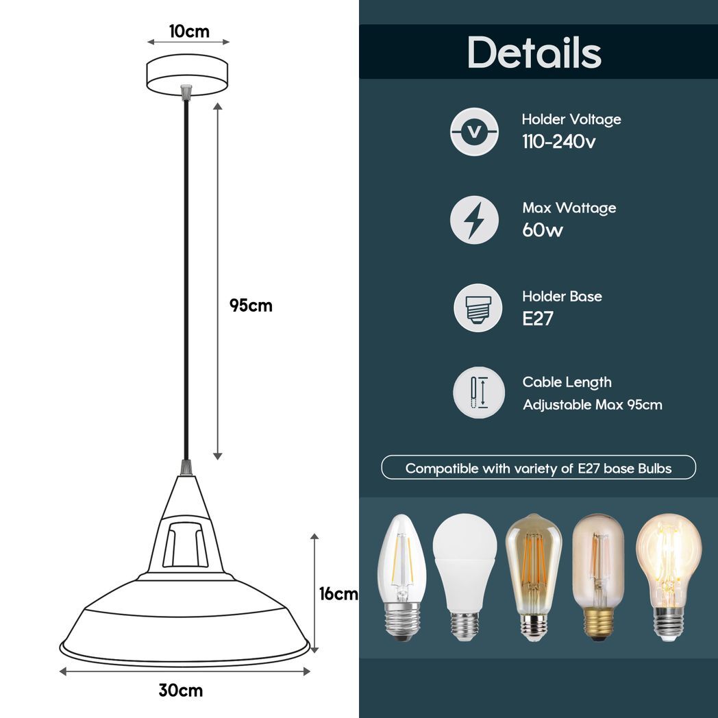 Features:This simple, sleek pendant has a finished appearance for a vintage appearance.A wonderful choice for achieving your desired fashion and functional needs of your home.It will make your home more interesting and attractive.E27 lamp base, you can choose any bulbs with the E27 interface as you want.Perfect to create a warm, romantic atmosphere for your home.Item Specifications:Item Type: Pendant lamp kitStyle: Vintage/RetroVoltage: 110V-240VLamp holder quantity: 1Material: Metal and PVCBulb Requirements: Requires E27 max 60WBulb Type: Compatible with all kinds of E27 bulbsInstallation Area: IndoorPower Source: HardwiredDimmable: Yes (Required a dimmable bulb and dimmer switch)Wire length: 95cm Adjustable cable.Energy consumption: A+ with LED bulb.Sloped ceiling adaptable.Package included:1 x Celling rose with accessories.1 x Pendant holder with 95cm cable.1 x Light shade.Note:Due to the light and screen difference, the colour of the item may be slightly different from the pictures.Please allow 1-2cm differences due to manual measurement.Delivery times can vary depending on the destination location. We would advise against booking an electrician or fitter until you have received all items in satisfactory condition.Please kindly confirm the colour of the lamp before you buy it.