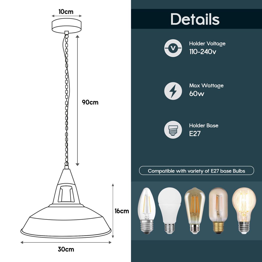 Features:This simple, sleek pendant has a finished appearance for a vintage appearance.A white painted on the inside of the hood enhances the illumination.It will make your home more interesting and attractive.E27 lamp base, you can choose any bulbs with the E27 interface as you want.Perfect to create a warm, romantic atmosphere for your home.Item Specifications:Item Type: Pendant lamp kitStyle: Vintage/RetroVoltage:110V-240VLamp holder quantity:1Material: Metal and PVCBulb Requirements: Requires E27 max 60WBulb Type: Compatible with all kinds of E27 bulbsInstallation Area: IndoorPower Source: HardwiredDimmable: Yes (Required a dimmable bulb and dimmer switch)Wire length: 95cm Adjustable cable.Energy consumption: A+ with LED bulb.Sloped ceiling adaptable.Package included:1 x Ceiling rose with accessories.1 x Pendant holder with cable and chain.1 x Light shade.Note:Due to the light and screen difference, the color of the item may be slightly different from the pictures.Please allow 0.2-0.5cm differences due to manual measurement.Delivery times can vary depending on the destination location. we would advise against booking an electrician or fitter until you have received all items in satisfactory condition.Please kindly confirm the color of the lamp before you buy it.