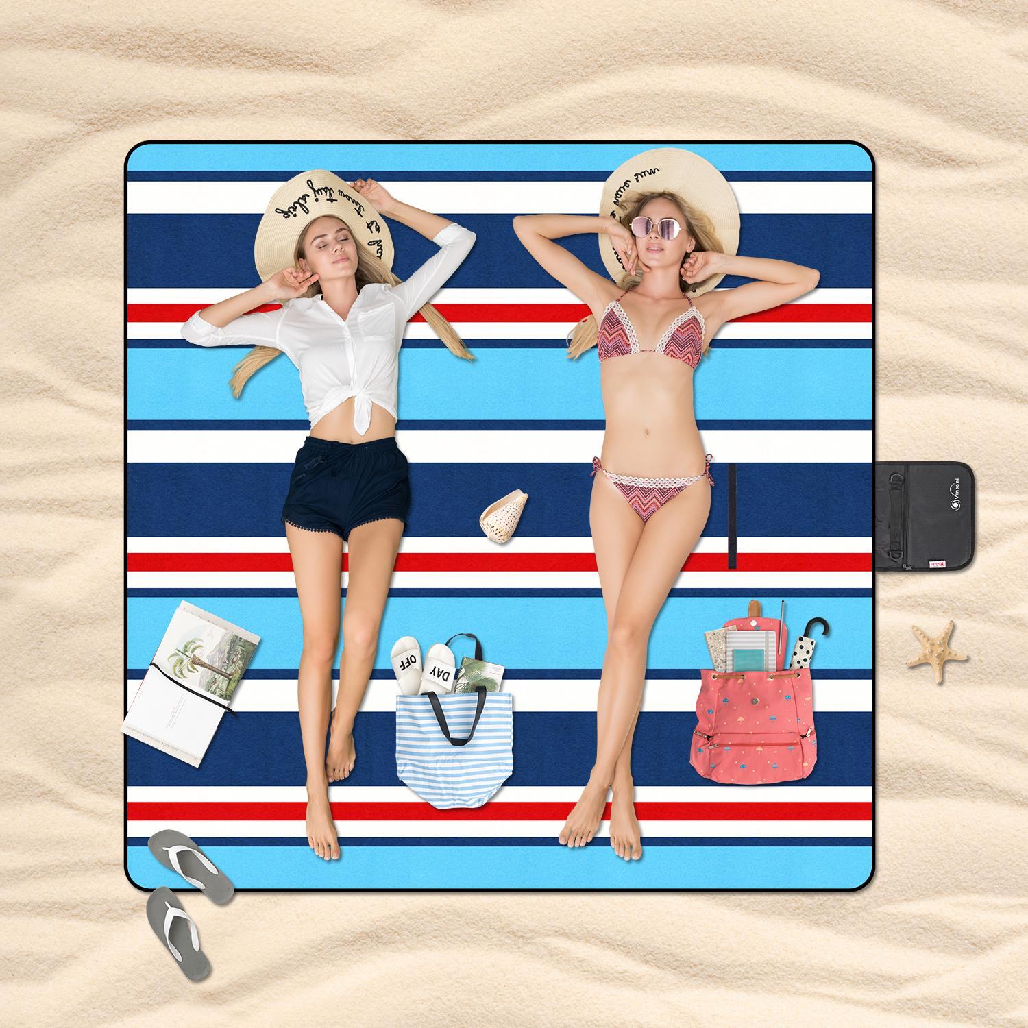 EASY CARRYING: This beach rug can be packed down to an impressive 40 x 27 x 10 cm; the attached flap and closure easily secure the blanket for easier portability; it is also light enough to stash in your bag.DURABLE MATERIAL: With the acrylic surface, ample sponge padding, this picnic blanket is tear-resistant and durable for extended outdoor use.EXTENSIVE USE: Suitable to be used indoors or outdoors, it is perfect for camping, picnics, days out to the beach or park, and summer festivals; it also can be used as a tent carpet or temporary bed.GOOD INSULATION: With the waterproof and sand proof backing that acts as insulation, keeping the top surface comfortable and dry when used on damp grass or beach.DIMENSIONS: 200 x 200 cm; this super-sized sheet can comfortably fit 2-4 people; ideal for family picnics and days out. Please note images are for illustration purposes only and the colour patchwork on the item may vary.