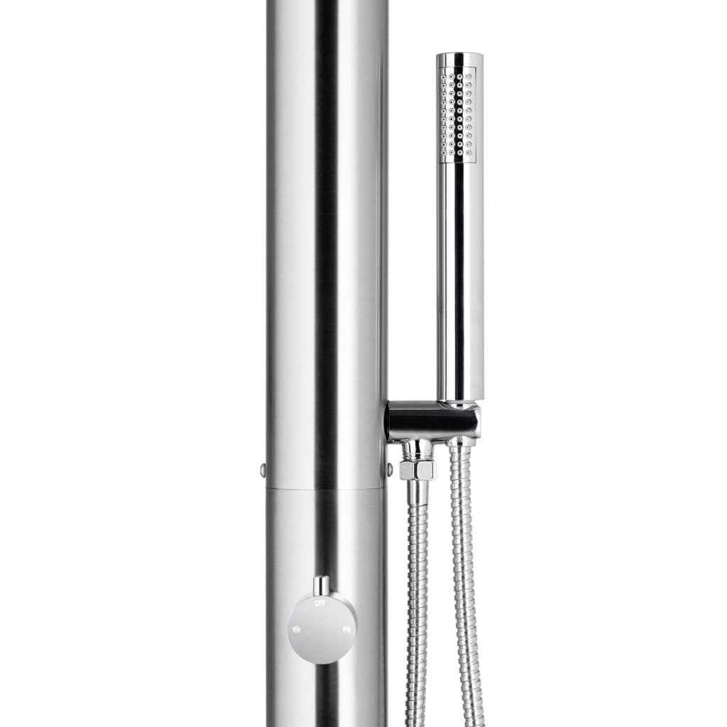 This garden shower featuring a modern design is meant to be a great addition to your swimming pool and other outdoor living areas. This outdoor shower is made of stainless steel, making it weather-resistance. The shower system has a head shower and a hand shower to meet your gardening, watering and quick showering needs. The hand shower features a double-locked flexible hose with a length of 1.5 m. It is also equipped with a brass hand shower holder. Soak yourself in a truly relaxing shower experience and enjoy the modern style of this outdoor shower system!