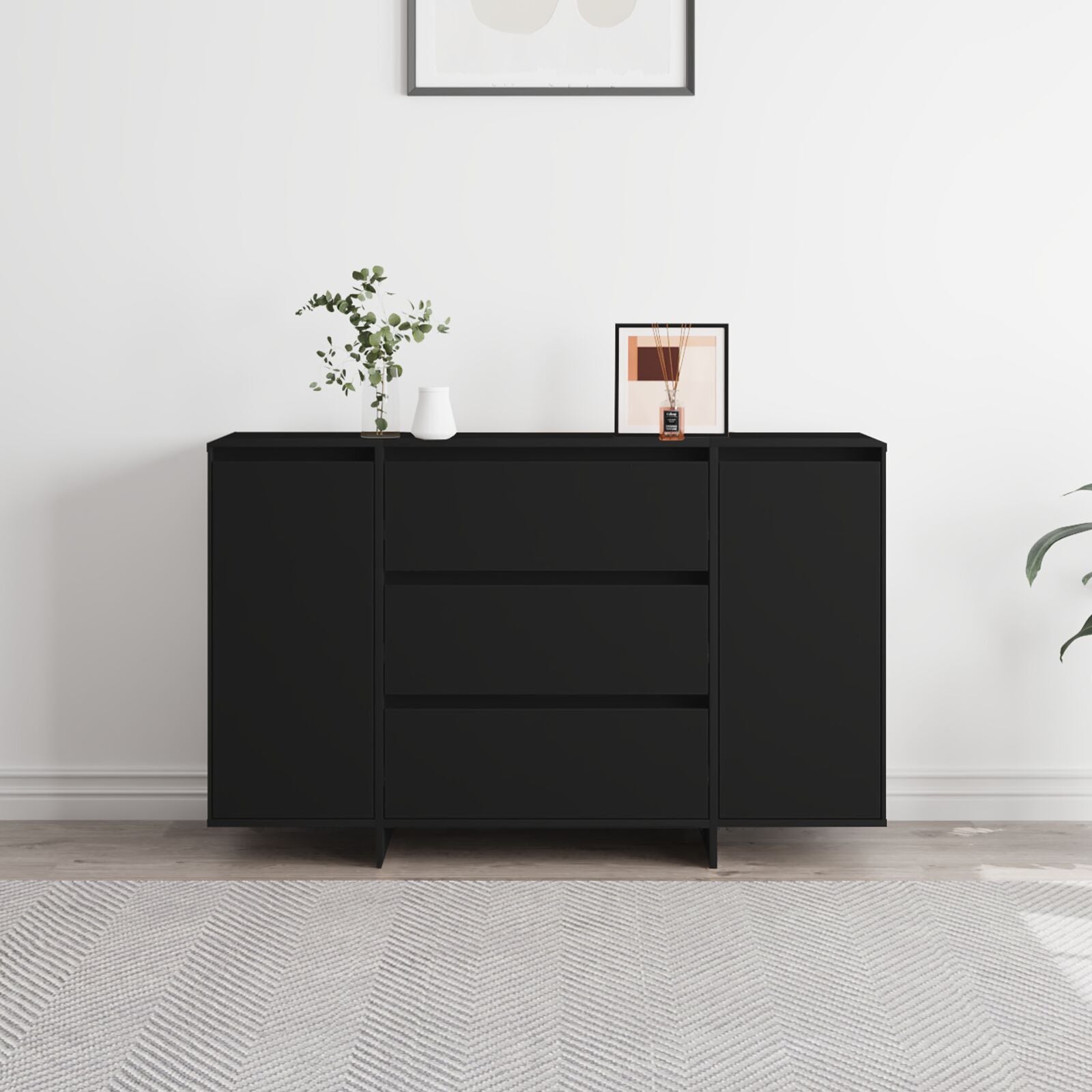 Looking for a stylish and functional storage solution? The Modern Sideboard fits right in! Its rectangular shape and modern vibe blend perfectly with contemporary interiors, creating a welcoming space while giving you loads of room to store your dining essentials and more. High-Quality Material: Made from engineered wood, this sideboard has a sleek modern finish. The tough surface lasts well, keeping its looks despite daily wear and tear. It's durable, so you can relax knowing it's a solid addition to your home. Functional Storage Components: This sideboard comes with shelves, a drawer, and hinged doors, so you've got great storage options. Keep your dining bits neat and tidy, from cutlery to tablecloths, making sure everything's easy to grab in a clutter-free space. Modern Aesthetic: With its simple rectangular shape and no-fuss design, this sideboard fits right into any modern home. The clean lines and lack of over-the-top decorations are just what you need for a stylish yet practical look. Room Compatibility: It's designed to fit in either your living or dining room, acting like a buffet for storing and showing off your stuff, and lifting the room's overall vibe. Its stylish looks make it suitable for both posh and relaxed settings, so it's a flexible pick for any home decor. Secure and Free-Standing: The sideboard includes a wall attachment to stop it from tipping, giving you extra peace of mind in busy homes. It's free-standing, so you can place it wherever you want, making sure it slots in nicely with your existing layout.