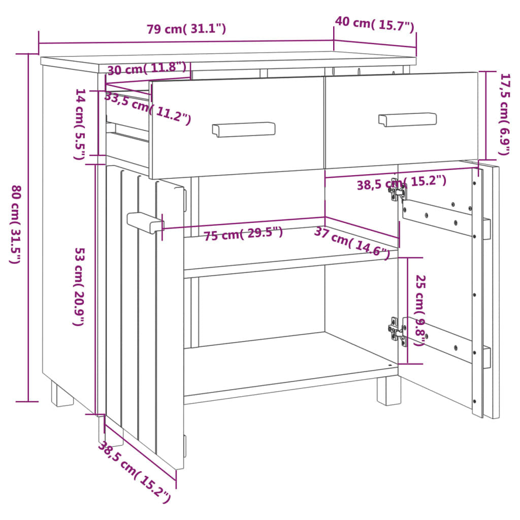 This wooden sideboard makes a decorative and practical addition to your decor. This drawer cabinet is made of solid pinewood, making it stable and sturdy. The highboard has 2 doors and 2 smooth sliding drawers, providing ample storage space for keeping your various daily essentials well organised and within easy reach. Additionally, the sturdy tabletop is perfect for displaying decorative objects, photo frames, and potted plants.