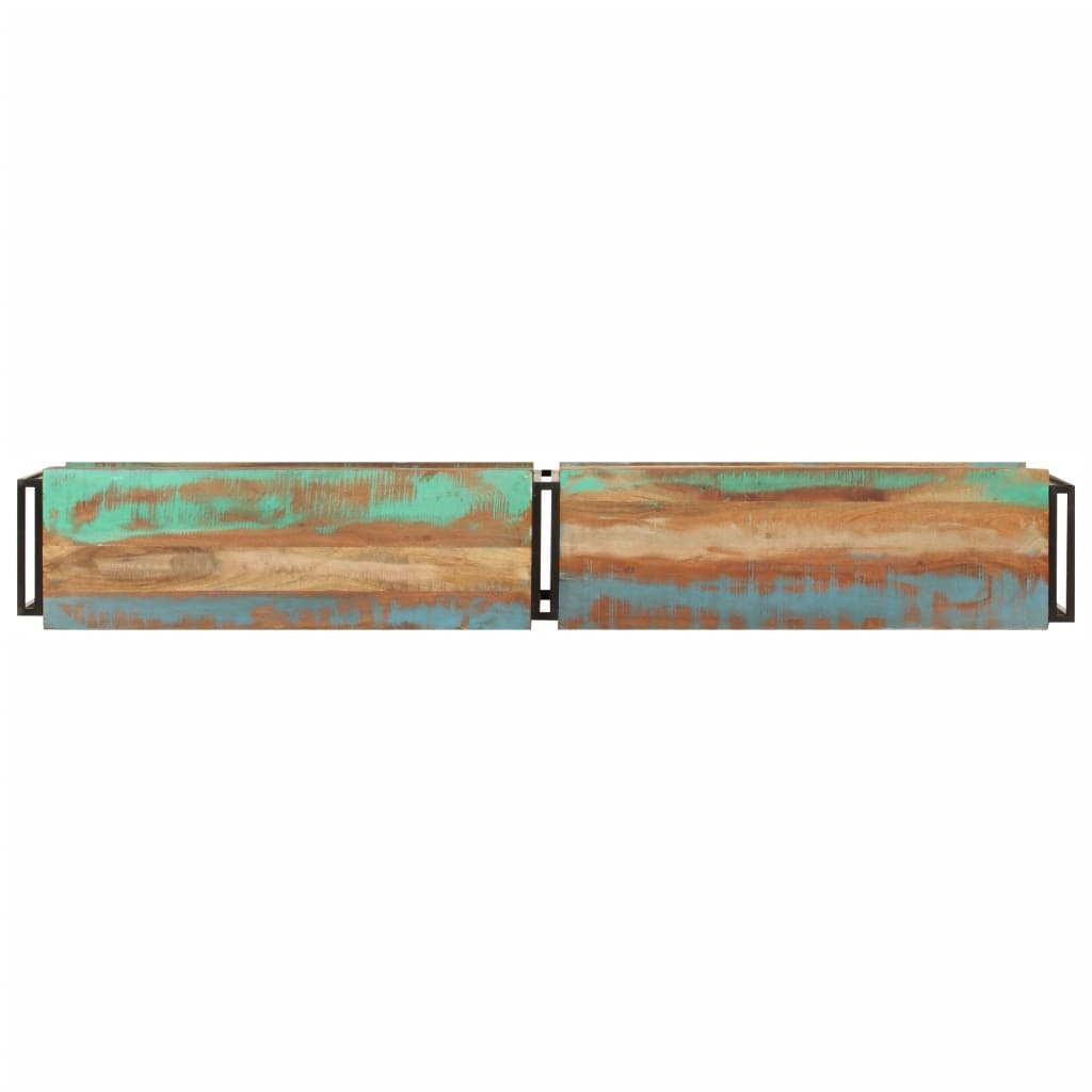 This trendy wooden TV cabinet, featuring a sleek and stylish design, is meant to be a decorative as well as practical addition to your room decor. Solid reclaimed wood: Solid reclaimed wood consists of reused timbers such as teak, mango wood, pinewood, and beech. These materials are recycled from old buildings such as factories, sheds, and boats. As every piece is handmade.colours will vary for each product.Ample storage space: The TV stand with shelves offers sufficient storage space to keep your essentials well organised and within reach.Metal frame: The metal frame ensures sturdiness and stability.Displaying function: The sturdy top of this TV bench is a perfect spot for displaying potted plants, framed photos and other decorative items. Good to know:Colours and grains vary per furniture item, making each piece unique. The delivery is random, ensuring the exclusivity and individuality of your product.