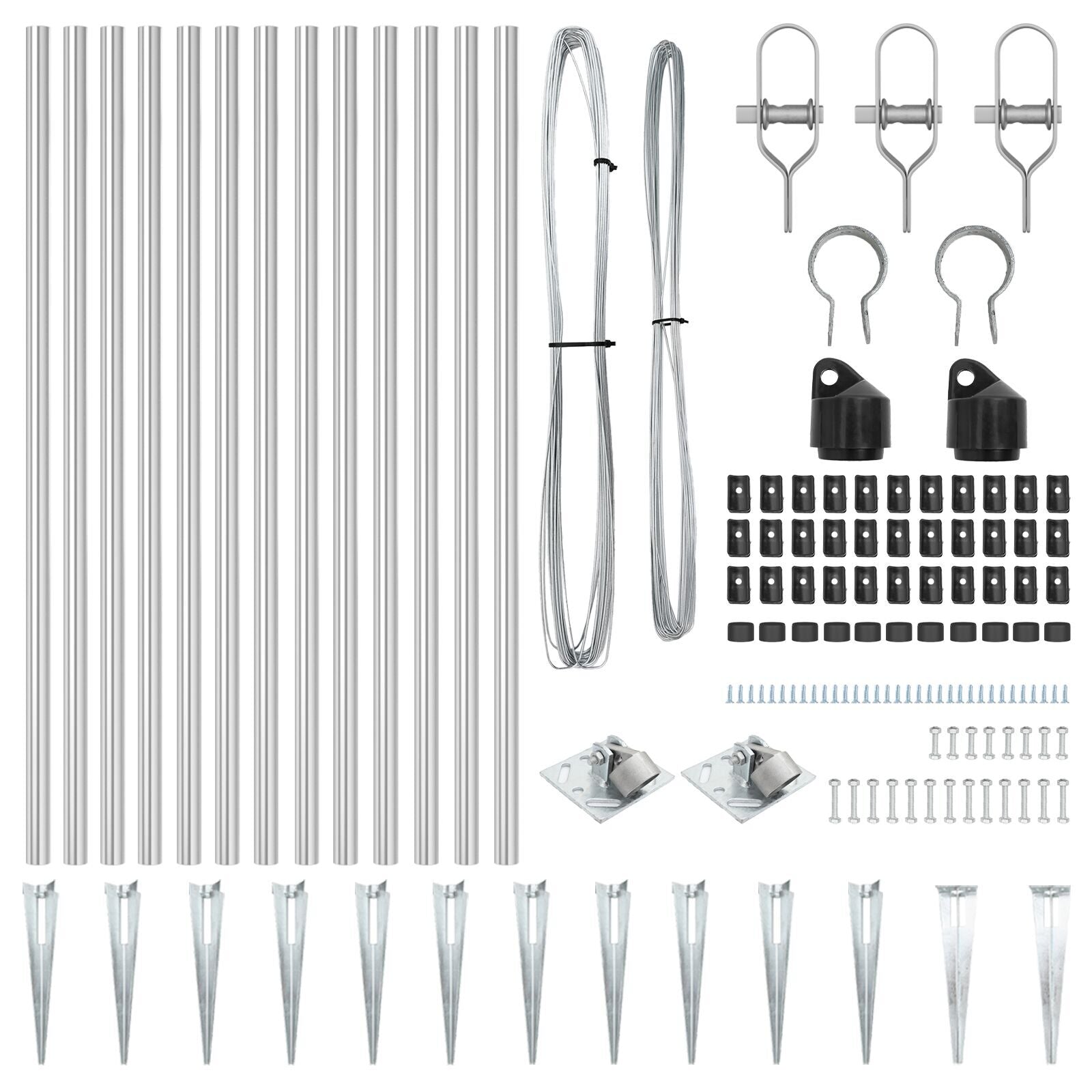 - 11 x Post, 2 x Angle post, 11 x Spike, 2 x Angle spike, 11 x Plastic cap, 33 x Plastic tension wire supporter, 2 x Angle post cap, 2 x Angle post hardware, 3 x Tensioner, 1 x 25m Binding wire, 1 x 80m Tension wire