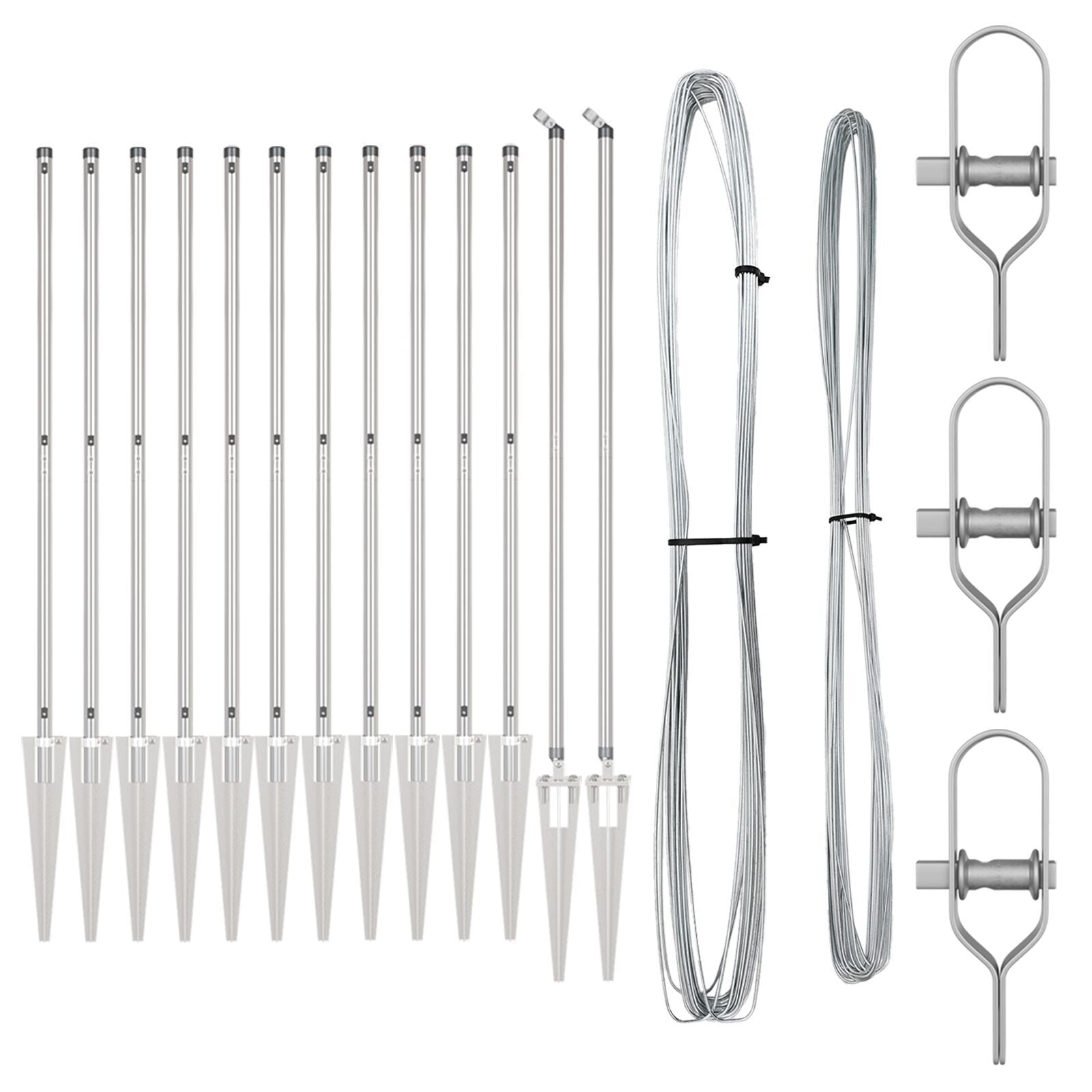 - 11 x Post, 2 x Angle post, 11 x Spike, 2 x Angle spike, 11 x Plastic cap, 33 x Plastic tension wire supporter, 2 x Angle post cap, 2 x Angle post hardware, 3 x Tensioner, 1 x 25m Binding wire, 1 x 80m Tension wire